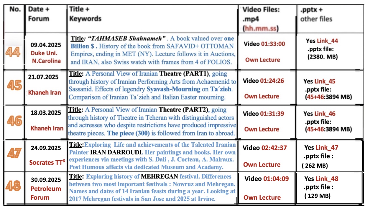 NB: Links to youtube addresses: LInk_01: https://youtu.be/yEmoFybo1YM Link_04: https://www.youtube.com/watch?v=HpwlR3xG2a8 Link_05: https://youtu.be/H4ET0dZ2k2I Link_10: https://www.youtube.com/watch?v=R7YgmfxKc5U Link_11, Session 1: https://www.youtube.com/watch?v=pq-JBT69VUQ Link_11, Session2: https://www.youtube.com/watch?v=vEnbKcnpaaY Link_13: https://youtu.be/lJrM5GcvgXA Link_14, A.ROHANI: https://youtu.be/G0WZlTGm90I Link_14, S.ROHANI: https://youtu.be/gEJmXAKz-RM Link_14, AMUT-2010 : https://drive.google.com/file/d/1S8JdYfvTNyVauE48f8BH-xxWWWn1S7JC/view?usp=share_link Link_15: https://www.youtube.com/watch?v=_nxsO1dylSY Link_16: https://youtu.be/bqbrCsTOA4k Link_17: https://youtu.be/AT0_s98Tw8k Link_18: https://www.youtube.com/watch?v=M2PceQe-aQY Link_19: https://www.youtube.com/watch?v=IIbwIqruKRw Link_20S: https://youtu.be/1eHbIfduX8I Link_20L: https://youtu.be/3YmmXRKzmQ0?si=UED-OA28F26C8ckU Link_21: https://youtu.be/UBUe5WQCqr4 Link_22: https://youtu.be/ayQVTXT4dMw Link_23: https://youtu.be/3LQ2hgVhJYc Link_24 :https://www.youtube.com/watch?v=saZL7jqEARU Link_27 : https://www.youtube.com/watch?v=C5ntbesYFMs Link_28 : https://www.youtube.com/watch?v=UTNqYsR3Wx8 Link_29 : https://www.youtube.com/watch?v=4zzJob_SFok Link_30: : https://drive.google.com/drive/folders/1kX1SZ92F7MqQ0mxGs2P9k3jw1mNp57K7?usp=share_link Link_31 : https://www.youtube.com/watch?v=b9SLDyXjRnA&t=40s Link_32 : https://www.youtube.com/watch?v=58l1278WDWA&t=494s Link_33: https://drive.google.com/drive/folders/1MVm-dT9u43bnoxJbk2SX_-qjC7E-BeuN?usp=share_link Link_34 : Link_44 Link_35 : https://www.youtube.com/watch?v=HW5WthGMPuI Link_36 ALL : https://youtu.be/S9njNNekEN0 Link_36 PART : https://drive.google.com/drive/folders/1MVm-dT9u43bnoxJbk2SX_-qjC7E-BeuN?usp=share_link Link_37 : https://www.youtube.com/watch?v=Gdb2kXBb6Ys  Link_39 : https://drive.google.com/file/d/1ST_-pbajVp1CkZNFNsqTmKCrHD8_j8d0/view?usp=sharing Link_40 : https://drive.google.com/file/d/1THviN873jKA_edMTsCiOOniXUkJt9t4c/view?usp=share_link Link_41A: https://drive.google.com/file/d/1ybGctOKScgVwxoEEKiHy0NCDrvNAuDpd/view?usp=sharing Link_41B: https://drive.google.com/file/d/1oNO-zjXcOMTXZ82Hog_ybPdzWlLCcHEo/view?usp=sharing Link_42: https://drive.google.com/file/d/1ifkAbWzfRsbWIAczZvqlRAaOf5fvYTTB/view?usp=sharing Link_43 : https://drive.google.com/file/d/1IiOA_JaaATh4WUztFO8RqSjWANWpPRec/view?usp=share_link Link_44 : https://drive.google.com/file/d/1D767jybukl-ee40TdNgP8wE4eww8OVOP/view?ts=67fd41cd Link_45: https://www.youtube.com/watch?v=98IS8WelNpA Link_46: https://www.youtube.com/watch?v=Dn2xBj4CqPU Link_47: https://www.youtube.com/watch?v=_jI89Bwgw0Q  Link_48: https://youtu.be/FThzZ_nt6dU |